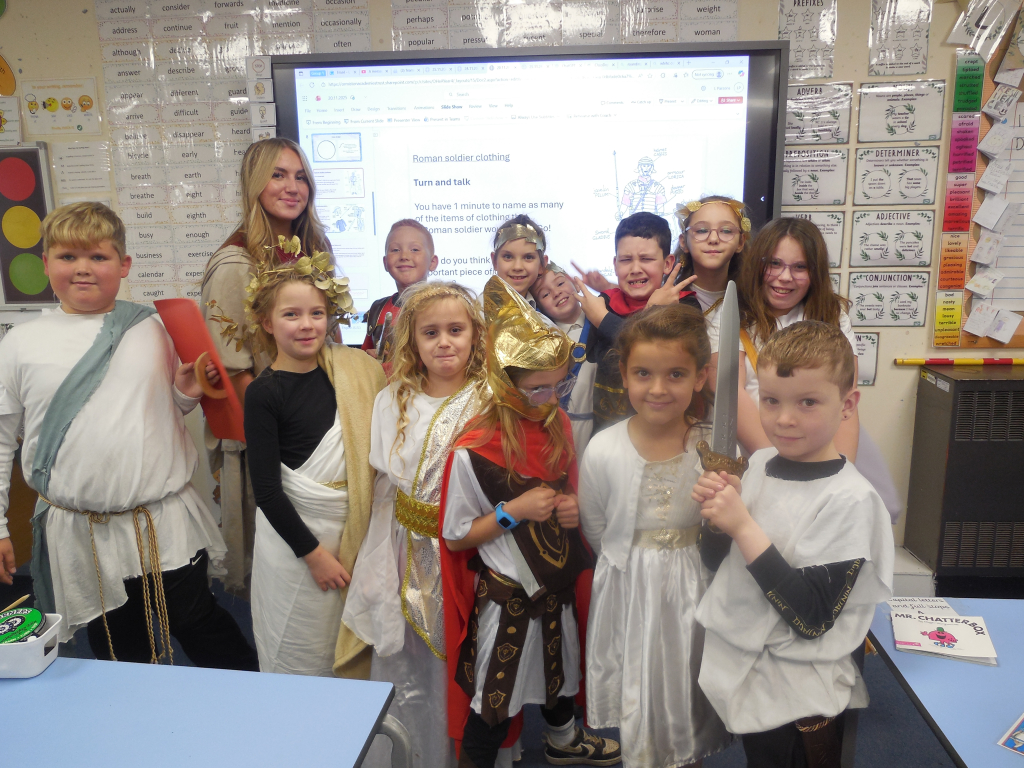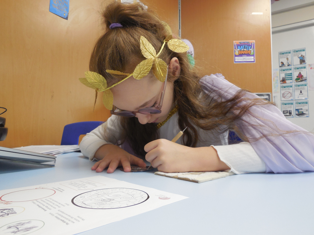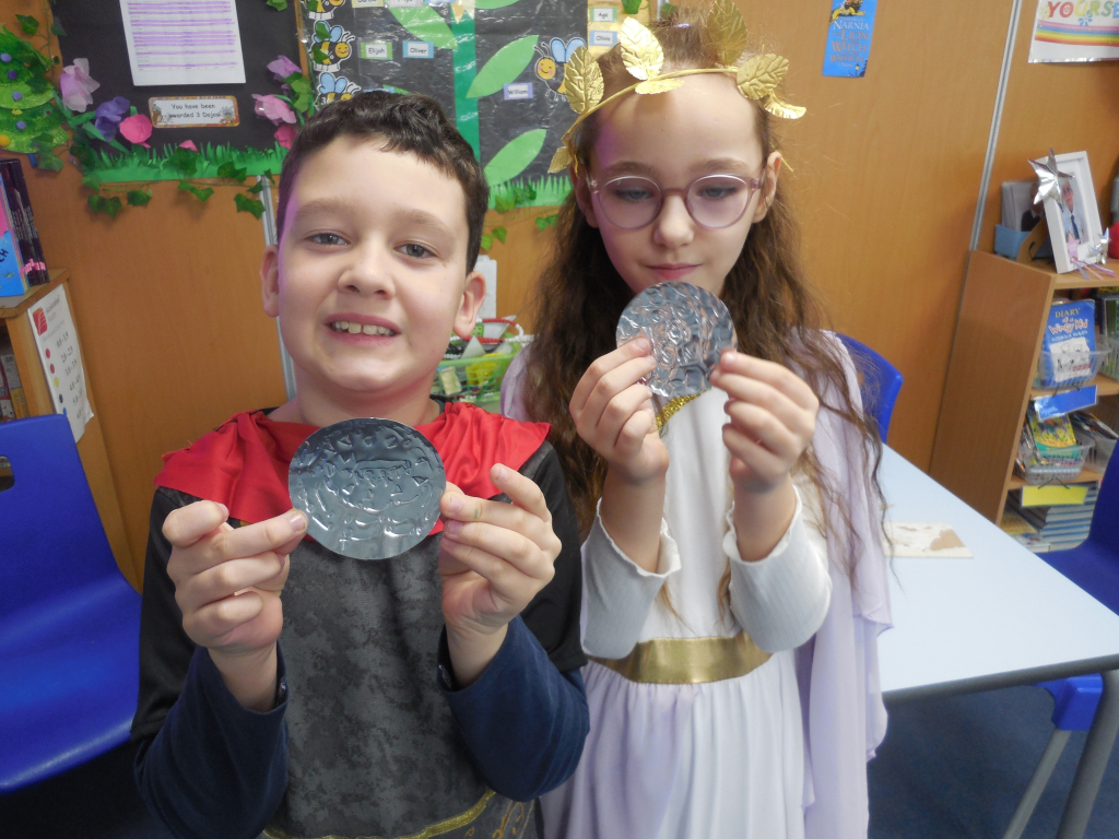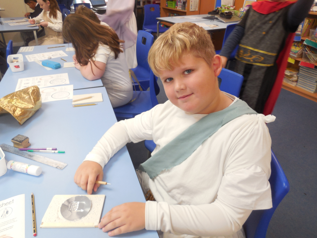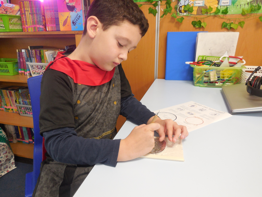 The day was packed with excitement as the children completed five thrilling challenges to earn their place in his army. They explored and handled authentic Roman weapons and clothing, marched through the school with booming chants and even designed and crafted their own Roman coins. The class examined fascinating artefacts to uncover their secrets and discovered what life was really like for a Roman soldier.