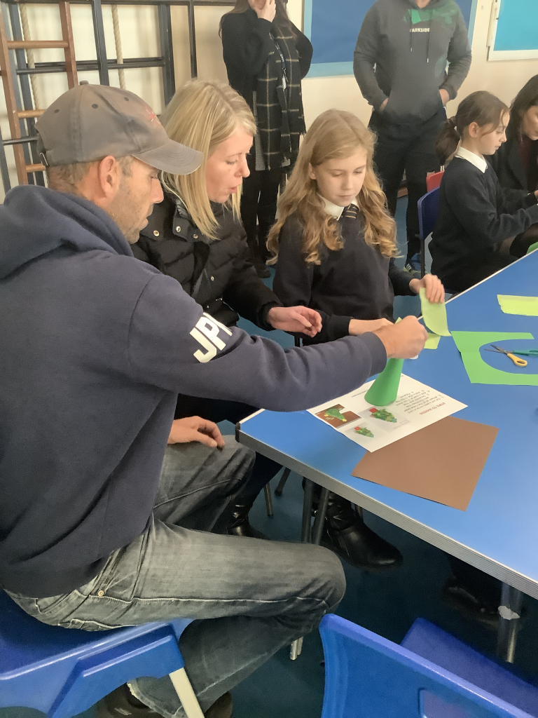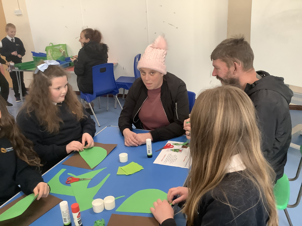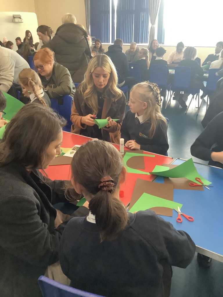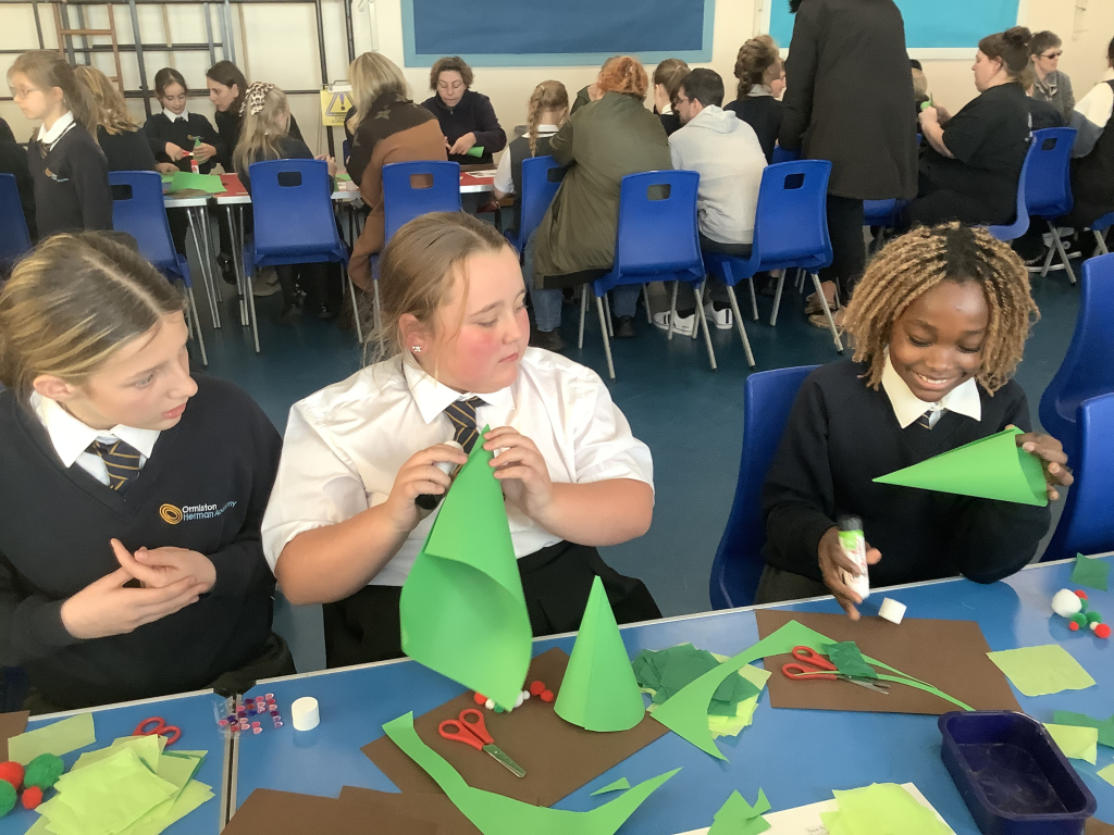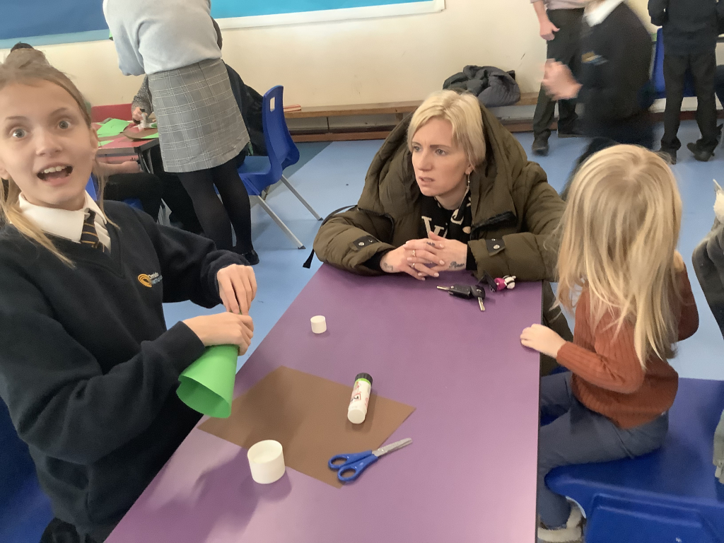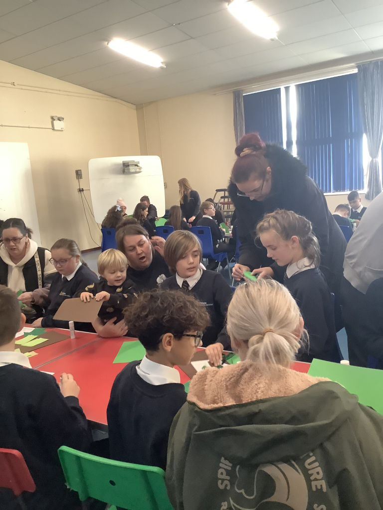 Laughter and chatter filled the room as pupils proudly showed their decorations taking shape, adding sparkling glitter and finishing touches with pom poms. The whole session had a joyful, cosy atmosphere, and it was lovely to see the children sharing ideas, helping their parents, and creating something special to take home for the holidays.