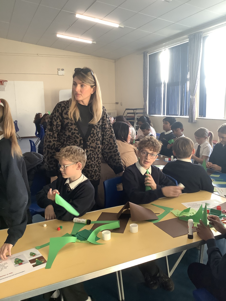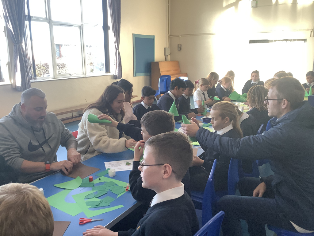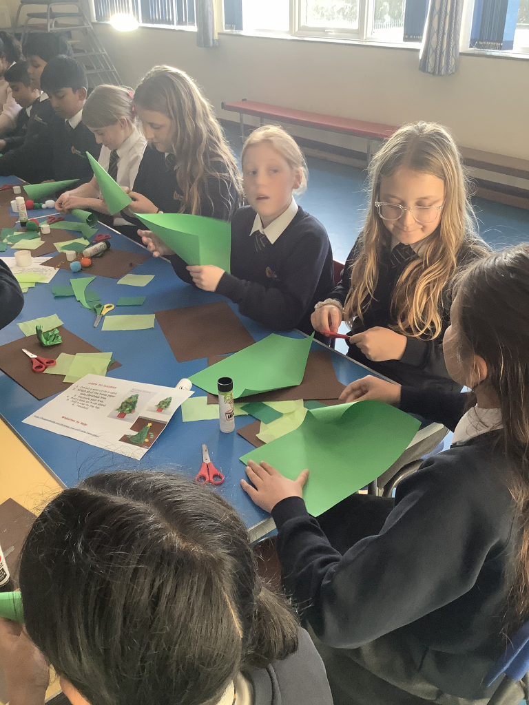 Year 6 welcomed their families into a warm and festive Christmas Craft Café, where the tables were covered with bright tissue paper, pots of glitter, and colourful pom poms. Children and parents worked side by side, carefully shaping layers of tissue paper for their vibrant Christmas trees, each one completely unique.